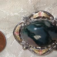 Today we are featuring a lovely Sterling Silver pin that has four 10K tri-color gold leaves (which is similar to Black Hills Gold) surrounding a creamy white / green agate stone.