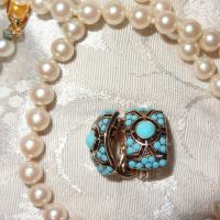 We have something very unique for your consideration today: a lovely pearl necklace with a fish hook clasp which we are pairing with a beautiful turquoise earring set.