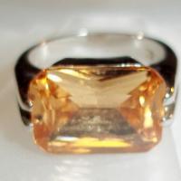 Lovely ring is a size 6 with 1/2" top stone set in silvertone. (this could be sterling, not marked but priced accordingly). The stone is a soft honey color cz in a modern silver setting. Very pretty.