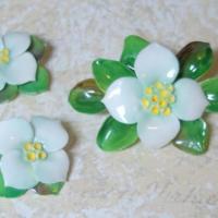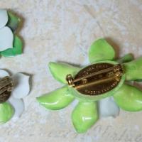 This is a beautiful set by Cara China, Staffordshire England. Porcelain Dogwood flower brooch measures 2" and the matching clip on earrings are about 1". Difficult to find these pieces in such good shape, but this was well kept in an estate. Vibrant colors and signed on the back.