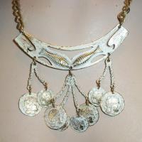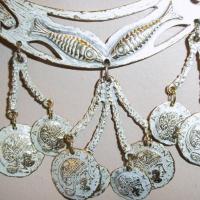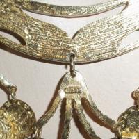 Outstanding necklace by Coro features an 18" goldtone textured chain leading to a front focus design of 4". Whitewashed goldtone with fish design and "Athena" coin charms drop from coral like branches across the front. Signed Coro.