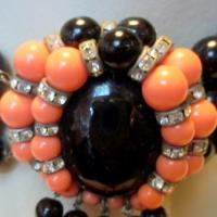 Absolutely fabulous art deco choker, dog collar necklace features 3 rows of black onyx? beads (ice cold to the touch). Front design features beautiful coral beads accented with rhinestone rondelles in a rosette with dangles. The front design measures 5" top to bottom. The necklace is 12" shortest strand and fastens in front with a slide in hidden clasp. This would have to be for a small neck but it would be easy to add beads to both sides of the focus design for lengthening. Matching the beads shouldn't be difficult. For a necklace like this - worth the effort !
