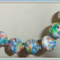 This is a beautiful beaded necklace featuring pink, blue, green and multi swirl art glass beads all measuring about 10mm and making up a single strand necklace of 26" with goldtone barrel clasp. Great to wear alone or add to your other chains or beads for versatile looks !