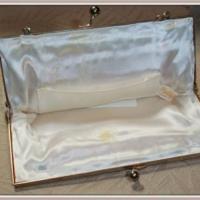 Very pretty art deco style white and metallic gold beaded purse measures about 6 x 6" with goldtone frame and chain handle. Inside white satiny material nice and clean with one stain. Side pocket. Walborg tag. Beading is also in good condition. There are a few bead pulls, Not really very noticeable and easy fix. Still a very serviceable and collectible bag.