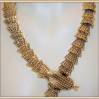 This is a fantastic snake necklace (if you like snakes) - Heavily textured goldtone necklace wraps to the front where the snake's head forms a magnetic closure. Neckline is about 20". Rhinestone eyes. Contemporary well made necklace sure to cause excitement !