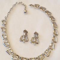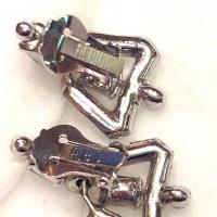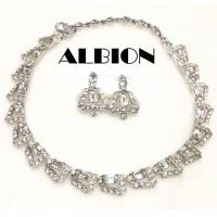 Outstanding vintage Albion clear rhinestone necklace and clip earrings set features gorgeous, high-quality crystal rhinestones in emerald cut and round shapes in heavily rhodium plated silver tone metal. The necklace is adjustable to 15-1/4" with an unusal incorporated hook and extender chain that ends with a whopping round rhinestone. The matching clip earrings are elegant drops that are approximately 1-1/4" long. The set is quality and mimics that of Bogoff and surprised us when we saw the Albion signature. Not much is known about Albion and the pieces are rare. In fact, designs we have seen are very reminiscent of Bogoff so much so that we are tempted to wonder if they were made in the same factory. This set is bright with that special vintage sparkle of old, heavy crystal rhinestones and rhodium. It was very difficult to photograph and we wish you could see this one in person. It is amazing. Perfect for a bride to wear and make a family heirloom, this set speaks to the reason so many of us love vintage costume jewelry -- a quality level in craftsmanship, design and materials that is not often seen again. A wonderful example and a timeless rhinestone set by Albion. (45958-45958Albion)