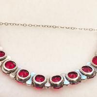 Large, open-backed, red crystals rich, juicy red alternate with barbell shapes of sterling silver, edged with beaded silver texture are punctuated with crystal rhinestones on each end.