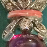 PLEASE NOTE: There is a minute manufacturing defect on one of the decorative leaf sections on the right side above the lower, round, simulated ruby cabochons. This is undetectable without a jeweler's loupe, but must be disclosed. This piece is “As Found” and to our experienced eye, no replacements or repairs have been made. There is no indication of a repair to the originally manufactured pin brooch, but it is often the case in costume jewelry manufacturing that each piece does not emerge from the mold well in a particular spot -- something like my baking! LOL. (Usually costume jewelry houses have a special person who works wonders with manufacturing imperfections.) This was probably thought to be an acceptable flaw. After all, in the early 1940s, this was just "costume or junk jewelry!"