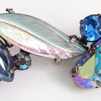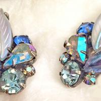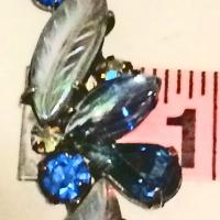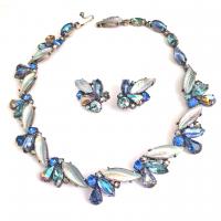 Vintage Kramer necklace and earrings is a set from my personal collection. A mouth-watering collection of AB blue elongated and gracefully curved leaves celebrated with Aurora Borealis sapphire blue, juicy cabochons, AB light Colorado topaz color round rhinestones and pear-shaped rhinestones and shades of light blue and deep blue round rhinestones in darkened silver tone metal. This is a gorgeous and very special Kramer necklace and earrings set from the 1960s that is intricately well-designed set with a mesmerizing collection of stones.that change color with every movement and light reflection.