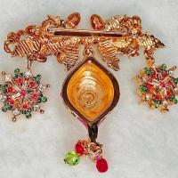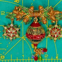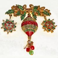 Vintage Christmas Pin Brooch by St. John is a holiday fantasy of holiday foliage dangling a beautiful ornament flanked by red green and clear rhinestone dangling snowflakes finished with a gathering of festive crystals. St. John Christmas jewelry was made for a short time. The pieces were relatively expensive and they are prized for their detailed designs and luscious upscale execution.