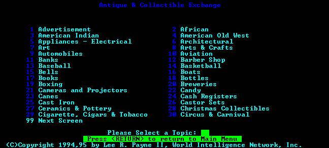 These images show what it looked like to dialup or telnet into the server using a ANSI/VT100 client. The menus changed a little from 1991-1995, but the functionality is the same. These are not all of the features that the system had, but just a quick overview. (click on any image to see it's full size verion).