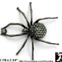 Black Widow Spider Pin in Black Diamond colored rhinestones in darkened hematite colored silver tone metal is clutching a gorgeous, sparkling hematite colored rhinestone catch. This sparkling Black Diamond colored crystal pave rhinestone spider pin has a row of large and darkly sparkling hematite clear rhinestones around his neck and has jet black crystal rhinestone eyes. He measures approximately 2-7/8 x 2-3/4" and has a safety closure. You will be so impressed with the quality of the stones on this spider pin with their dark, glinting sparkle. Guaranteed to capture many admiring glances in its lair! (#33855-BlackWidowSpiderPinBlkDiamondHematite)