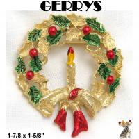 Christmas wreath pin with candles features Aurora Borealis clear, bright red and emerald green rhinestones with red and green enamel holiday foliage in gold tone metal with three white enamel candles with iridescent glitter within and Aurora Borealis clear rhinestone flames. This lovely Christmas wreath pin measures approximately 1-5/8" round and has a safety closure. A bright and sparkling classic Christmas wreath with candles pin that will add a festive holiday note to your jacket lapel, sweater or coat. (#40887-ChristmasWreathCandlesPinRhinestone)