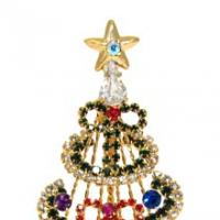 Free standing rhinestone Christmas tree pin has graceful curved boughs in clear and emerald green prong-set rhinestones with three graduated rhinestone dangle bows with rhinestone centers. Twisted gold tone rays emanate from behind the tree to attach graduated rhinestone "ornaments" so that they seem to be suspended in air in cobalt blue, pink, topaz color and purple rhinestones. There is a pear-shaped clear rhinestone beneath a gold tone treetop star that has an Aurora Borealis clear rhinestone center. The base of the tree is marquise shaped, with clear rhinestones to allow the tree to stand on its own to display on a table or setting of other free standing Christmas tree pins for a holiday scene when you are not wearing it as a brooch. This lovely and colorful free standing Christmas tree pin measures approximately 4 x 2" and has a safety closure. Uniquely beautiful! (#41051-Tree534)