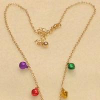 Christmas Santa Claus pendant on a colored jingle bell chain is sure to be a festive accessory for the holidays! In gold tone metal, the jaunty Santa has a white enamel beard with his red cap adorned with a sparkling, clear rhinestone pom-pom. The pendant measures approximatley 1 x 3/4" and comes on its own gold tone chain that is decorated with three small jingle bells in metallic blue, gold red and purple. The chain is adjustable from a generous 17" to 19-1/2" with a secure and sturdy lobster clasp closure. This will make a great Christmas gift for Secret Santas, gift exchanges, teachers, baby sitters and many others that will bring a smile to all who see it. (#46012-ChristmasSantaNecklaceColoredOrnaments)
