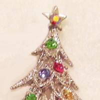Contemporary Christmas tree pin is a very nice reproduction of a famous Hollycraft Christmas tree pin design pictured in many books. This version features overlapping boughs sprinkled with tanzanite, pink sapphire, peridot, golden topaz and light sapphire color rhinestones in bright silver tone metal to form a quality contemporary take on this iconic Christmas tree pin design. The Christmas tree sits in a decorative, fluted pot and is topped with an Aurora Borealis clear rhinestone-appointed star. Slightly smaller than the origiinal, vintage Hollycraft Christmas tree pin that this one mimics very nicely, this lovely Christmas tree pin measures approximately 1-3/4 1" and has a safety closure. An iconic vintage Christmas tree pin design, reproduced in a smaller size, in a confection of classic colors and beautiful crystal rhinestons for this generation and the next. (#46031-Tree663)