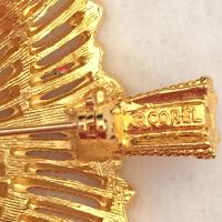 This beautiful Christmas tree pin of textured gold tone tiers, edged in shiny polished gold tone measures 2-1/8 x 1-7/8" and has a safety closure. In Excellent Condition, it dates from the 1960s and is signed, "COREL" raised from the mold on the reverse of the piece. Coro was a division of Coro Jewelry.